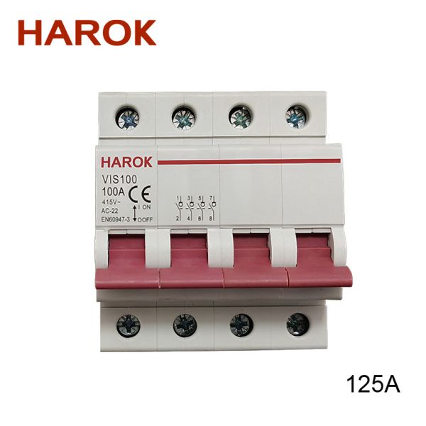 HAROK VIS100 Main Switch Isolator is a type of rotary isolator with cable/U-type busbar/pin-type busbar terminal connection, which can be connected from top and bottom. This product is widely used in the switchgear and storage battery industries and is an essential part of din rail products. With its high electrical and mechanical life of 1,500 and 8,500 respectively, it is a reliable and effective choice for many applications.